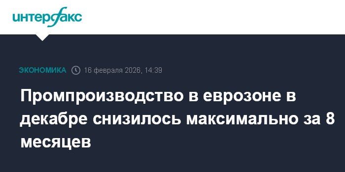 Москва. 16 февраля. INTERFAX.RU - Промпроизводство в еврозоне в декабре снизилось на 1,4% к ноябрю - максимальными темпами с апреля 2025 года, говорится в отчете Статистического управления Евросоюза Eurostat.