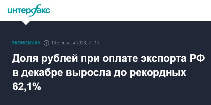 Москва. 16 февраля. INTERFAX.RU - Доля платежей в рублях при расчетах за экспортные поставки товаров и оказание услуг по внешнеторговым контрактам РФ в декабре 2025 года выросла до рекордных 62,1% с 54,0% в ноябре (ранее максимальным был уровень сентября 2025 года - 59,6%), следует из данных ЦБ РФ о валютной структуре внешнеторговых расчетов.