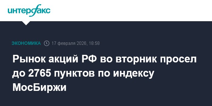 Москва. 17 февраля. INTERFAX.RU - Российский рынок акций во вторник снизился на фоне ухудшения внешней сырьевой конъюнктуры (подешевели металлы, нефть Brent просела ниже $67 за баррель) и в отсутствие позитивных сигналов с очередного раунда переговоров РФ-США-Украина в Женеве 17-18 февраля. Индекс МосБиржи откатился до 2765 пунктов после утреннего роста выше 2790 пунктов.