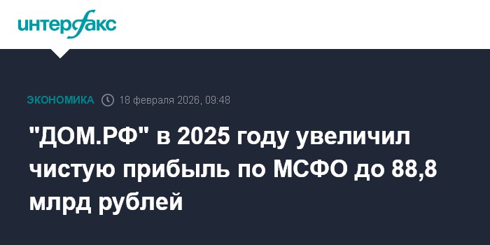 Москва. 18 февраля. INTERFAX.RU - ПАО "ДОМ.РФ" в 2025 году увеличило чистую прибыль по МСФО на 35,1% - до 88,8 млрд рублей по сравнению с 65,8 млрд рублей прибыли в 2024 году, следует из отчета компании.