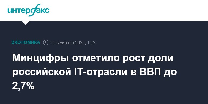 Москва. 18 февраля. INTERFAX.RU - Доля российской IT-отрасли в ВВП в 2025 году составила 2,7%, увеличившись на 0,2 п.п. к 2024 году, сообщил в Госдуме глава Минцифры Максут Шадаев.