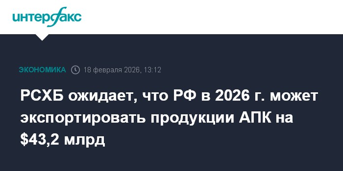 Москва. 18 февраля. INTERFAX.RU - Экспорт продукции АПК РФ в 2026 году может составить $43,5 млрд. Такой расчет сделал центр отраслевой экспертизы Россельхозбанка.