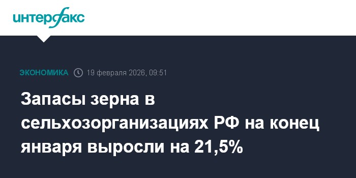 Москва. 19 февраля. INTERFAX.RU - Запасы зерновых и зернобобовых культур в сельхозорганизациях РФ на конец января составили 28,26 млн тонн, что на 21,5% больше, чем на конец января 2025 года, сообщает Росстат.