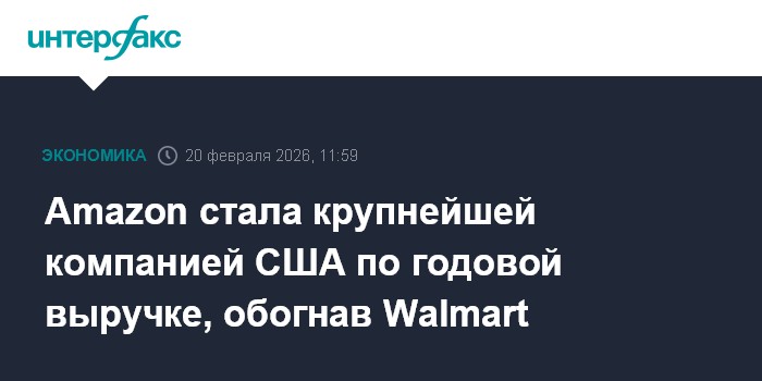 Москва. 20 февраля. INTERFAX.RU - Amazon.com Inc. обошла ритейлера Walmart Inc. по выручке за минувший год, став крупнейшей компанией США по этому показателю.