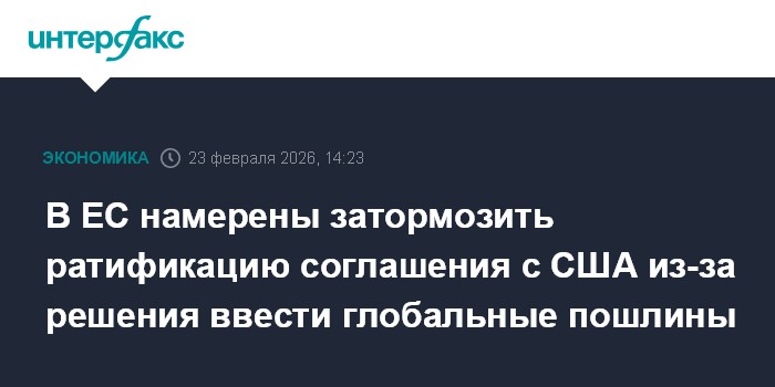 Москва. 23 февраля. INTERFAX.RU - В Европарламенте (ЕП) собираются приостановить процесс принятия торгового соглашения ЕС и США в связи с недавним решением американского президента Дональда Трампа ввести пошлины в отношении импорта из всех стран, передает Bloomberg.