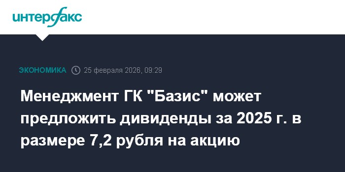 Москва. 25 февраля. INTERFAX.RU - Менеджмент ПАО "Группа компаний "Базис" (ГК "Базис", головная структура одноименного разработчика системного ПО) может предложить совету директоров рассмотреть возможность выплаты дивидендов за 2025 год в размере 7,2 рубля на одну акцию, говорится в сообщении компании.