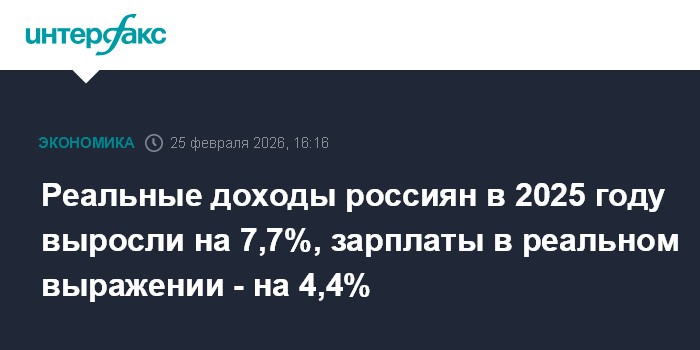 Реальные доходы россиян в 2025 году выросли на 7,7%, зарплаты в реальном выражении - на 4,4%