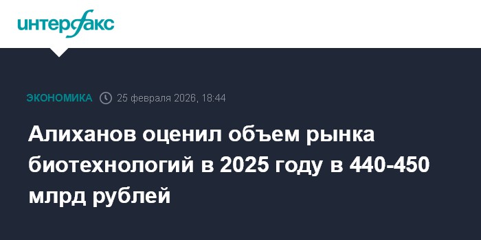Москва. 25 февраля. INTERFAX.RU - Объем российского рынка биотехнологий в 2025 году оценивается примерно в 440-450 млрд рублей, что соответствует уровню 2024 года, сообщил журналистам в кулуарах "Форума будущих технологий" глава Минпромторга Антон Алиханов журналистам в кулуарах "Форума будущих технологий".