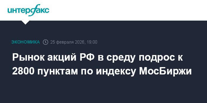 Москва. 25 февраля. INTERFAX.RU - Российский рынок акций в среду подрос на фоне позитивной динамики мировых фондовых площадок, а также в ожидании объявления даты и места следующей трехсторонней встречи делегаций РФ-США-Украина по мирному урегулированию. Индекс МосБиржи поднялся в район 2800 пунктов, при и этом сдерживающим фактором выступила просевшая нефть (фьючерс на Brent откатился ниже $70,7 за баррель после роста днем выше $71,5).