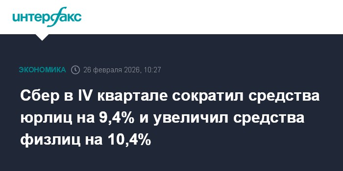 Москва. 26 февраля. INTERFAX.RU - Сбербанк в четвертом квартале 2025 года сократил средства корпоративных клиентов на 9,4% в связи с оптимизацией стоимости привлечений пассивов, средства физлиц, наоборот, показали прирост – на 10,4%. Об этом говорится в пресс-релизе группы по итогам публикации отчетности по МСФО.