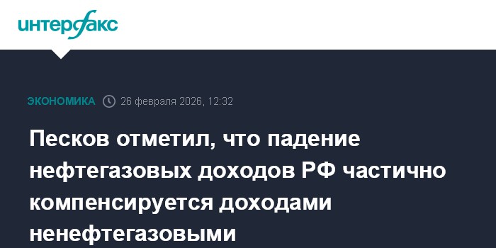Москва. 26 февраля. INTERFAX.RU - Падение нефтегазовых доходов России частично компенсируется доходами ненефтегазовыми, заявил пресс-секретарь президента РФ Дмитрий Песков.