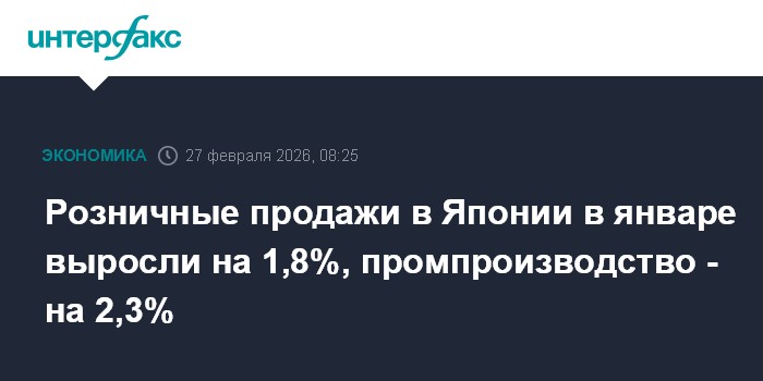 Розничные продажи в Японии в январе выросли на 1,8%, промпроизводство - на 2,3%
