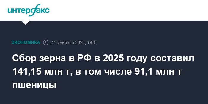 Москва. 27 февраля. INTERFAX.RU - Росстат опубликовал итоговые цифры по уборке урожая в РФ в 2025 году.