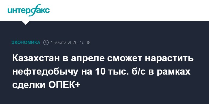 Москва. 1 марта. INTERFAX.RU - Казахстан сможет нарастить добычу нефти в апреле на 10 тыс. б/с, до 1,579 млн б/с в рамках сделки ОПЕК+, говорится в материалах ОПЕК, опубликованных на сайте Организации.