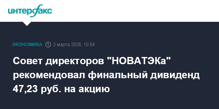 Москва. 2 марта. INTERFAX.RU - Совет директоров "НОВАТЭКа" рекомендовал финальный дивиденд за 2025 год в размере 47,23 рублей на акцию, сообщила компания. Дата закрытия реестра для получения дивидендов - 13 апреля.