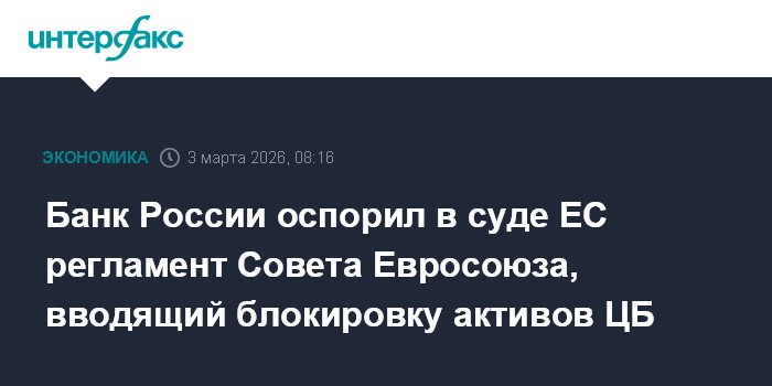 Москва. 3 марта. INTERFAX.RU - Банк России 27 февраля подал в Общий суд Евросоюза заявление об оспаривании регламента Совета Евросоюза, вводящего бессрочную заморозку активов ЦБ, сообщает сайт ЦБ.