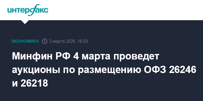 Минфин РФ 4 марта проведет аукционы по размещению ОФЗ 26246 и 26218