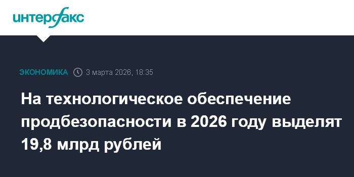 Москва. 3 марта. INTERFAX.RU - Федеральный бюджет в 2026 году предусматривает 19,8 млрд рублей на поддержку нацпроекта "Технологическое обеспечение продовольственной безопасности", реализация которого началась в 2025 году, сообщает Минсельхоз.