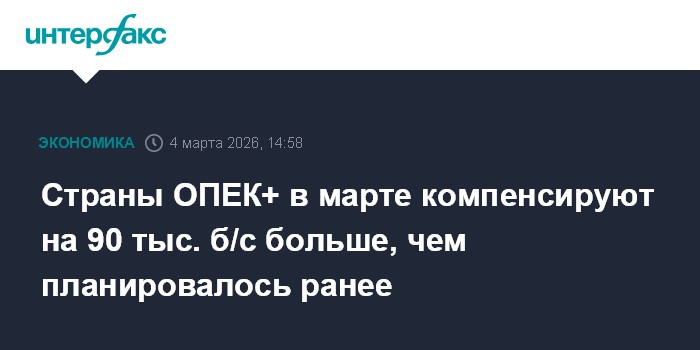 Москва. 4 марта. INTERFAX.RU - Страны ОПЕК+, участвующие в сокращениях добычи восьми "добровольцев", представили новый график компенсаций ранее недосокращенной добычи, - эти объемы, которые должны дополнительно к квотам сократить участники, указаны с февраля по июнь 2026 года.