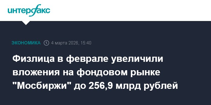 Москва. 4 марта. INTERFAX.RU - Физические лица в феврале 2026 года инвестировали на фондовом рынке "Московской биржи" 256,9 млрд рублей, что в 1,8 раза больше, чем в январе (139 млрд рублей), сообщила площадка.