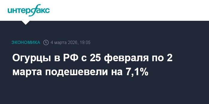 Москва. 4 марта. INTERFAX.RU - Цены на огурцы в РФ с 25 февраля по 2 марта (6 дней) снизились на 7,1%, сообщил Росстат в среду.