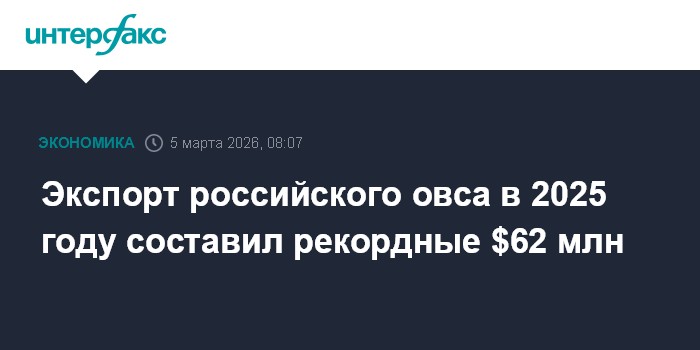 Москва. 5 марта. INTERFAX.RU - Россия в 2025 году экспортировала овса на сумму почти $62 млн, обновив рекорд, который был поставлен в 2024 году - $59,3 млн, сообщили "Интерфаксу" в федеральном центре "Агроэкспорт".