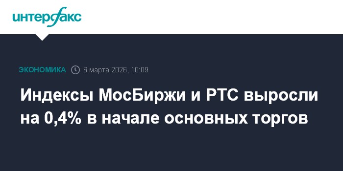 Индексы МосБиржи и РТС выросли на 0,4% в начале основных торгов