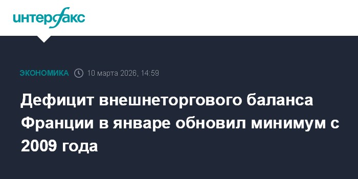 Москва. 10 марта. INTERFAX.RU - Отрицательное сальдо внешнеторгового баланса Франции в январе уменьшилось до 1,8 млрд евро с пересмотренных 4,3 млрд евро месяцем ранее, сообщило министерство экономики и финансов.