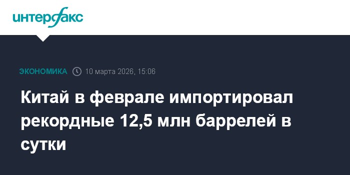 Москва. 10 марта. INTERFAX.RU - Среднесуточный импорт нефти Китаем в феврале составил 12,53 млн б/с, что является новым рекордом для этого месяца, свидетельствуют расчеты "Интерфакса" на основе данных Главного таможенного управления (ГТУ) КНР.