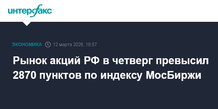 Москва. 12 марта. INTERFAX.RU - Российский рынок акций в четверг вырос на фоне отскока мировых цен на нефть (фьючерсы на Brent поднялись в район $100 за баррель) из-за эскалации ситуации на Ближнем Востоке, индекс МосБиржи превысил 2870 пунктов, при этом динамика blue chips оказалась смешанной на фоне выборочной фиксации прибыли игроками.
