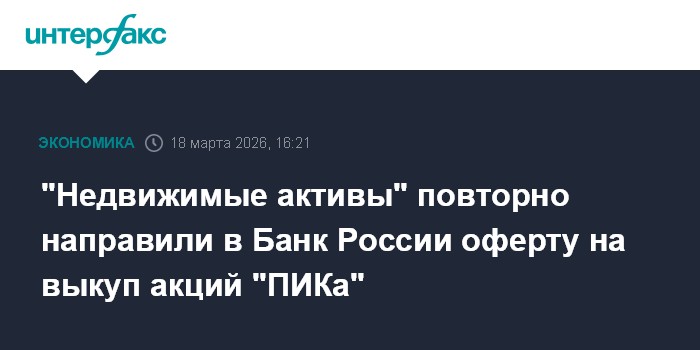 Москва. 18 марта. INTERFAX.RU - АО "Недвижимые активы" повторно направило в Банк России оферту на выкуп акций ПАО "ПИК-Специализированный застройщик", говорится в сообщении на ленте раскрытия.