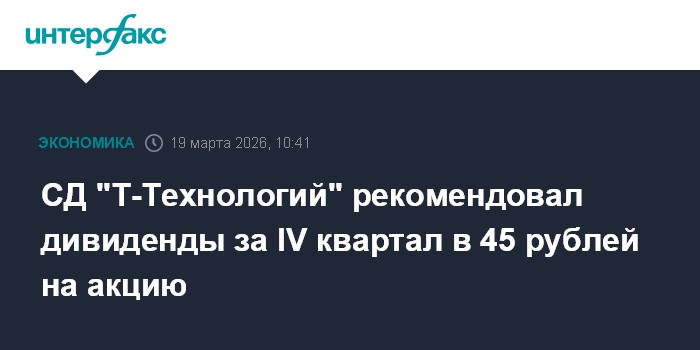 Москва. 19 марта. INTERFAX.RU - Совет директоров МКПАО "Т-Технологии" рекомендовал направить на выплату дивидендов за IV квартал 2025 года 45 рублей на одну акцию, сообщила группа.