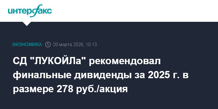 Москва. 20 марта. INTERFAX.RU - Совет директоров "ЛУКОЙЛа" рекомендовал финальные дивиденды за 2025 год в размере 278 рублей на акцию, сообщила компания.