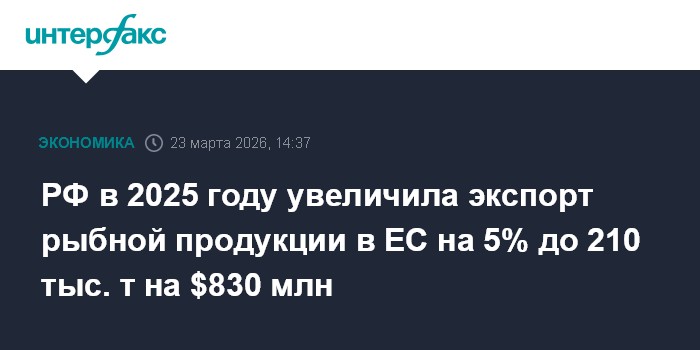 Москва. 23 марта. INTERFAX.RU - РФ в 2025 году экспортировала в ЕС 210 тыс. тонн рыбы и рыбной продукции на $830 млн. Оба показателя на 5% выше, чем в 2024 году, сообщает Рыбный союз по итогам анализа данных Евростата.