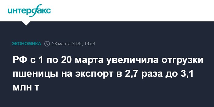 Москва. 23 марта. INTERFAX.RU - РФ с 1 по 20 марта отгрузила на экспорт 3,1 млн тонн пшеницы, что в 2,7 раза больше, чем за аналогичный период прошлого года, сообщается в мониторинге Российского зернового союза.