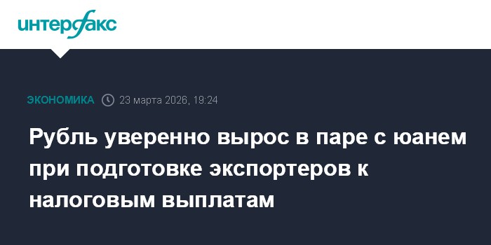 Москва. 23 марта. INTERFAX.RU - Китайский юань заметно опустился на Московской бирже по итогам торгов в понедельник, рубль вырос при подготовке экспортеров к налоговым выплатам марта. Согласно расписанию Федеральной налоговой службы, в следующий понедельник, 30 марта, в бюджет должны быть перечислены НДФЛ, страховые взносы, НДПИ, акцизы, налог на прибыль и НДД.