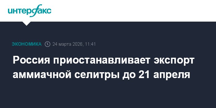 Москва. 24 марта. INTERFAX.RU - Россия ужесточила ограничения на вывоз аммиачной селитры на период с 21 марта по 21 апреля 2026 года, сообщил Минсельхоз.
