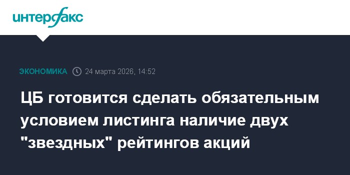 Москва. 24 марта. INTERFAX.RU - Наличие двух рейтингов акций может стать обязательным условием для листинга ценных бумаг компаний, сообщил на вебинаре "Эксперт РА" "Рейтинги акций для оценки публичных компаний" замдиректора департамента корпоративных отношений Банка России Сергей Моисеев. По его словам, такое решение может быть принято в четвертом квартале 2026 года.