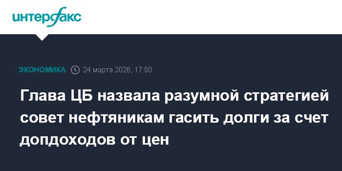 Москва. 24 марта. INTERFAX.RU - Совет президента РФ компаниям нефтегазовой сферы погашать долги за счет дополнительных доходов от цен на энергоносители - не признак их закредитованности, а просто разумная стратегия, заявила председатель Банка России Эльвира Набиуллина.