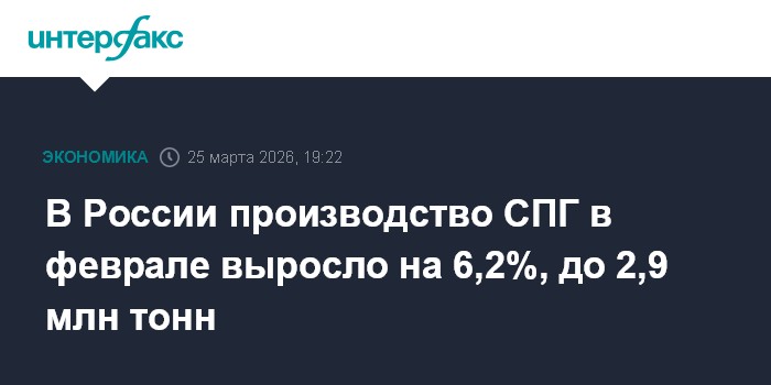 Москва. 25 марта. INTERFAX.RU - В России в феврале 2026 года производство сжиженного природного газа составило 2,9 млн тонн, что на 6,2% больше, чем годом ранее, сообщил Росстат.
