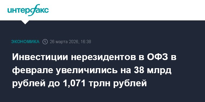 Москва. 26 марта. INTERFAX.RU - Объем инвестиций нерезидентов в ОФЗ в феврале 2026 года увеличился 38 млрд рублей, или на 3,7%, до 1 трлн 71 млрд рублей, сообщает сайт Банка России.