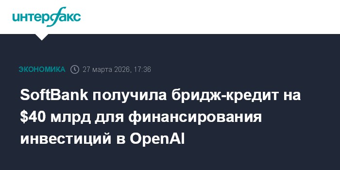 Москва. 27 марта. INTERFAX.RU - Японская SoftBank Group Corp. получила бридж-кредит в размере $40 млрд для финансирования инвестиций в OpenAI, а также общих корпоративных целей.