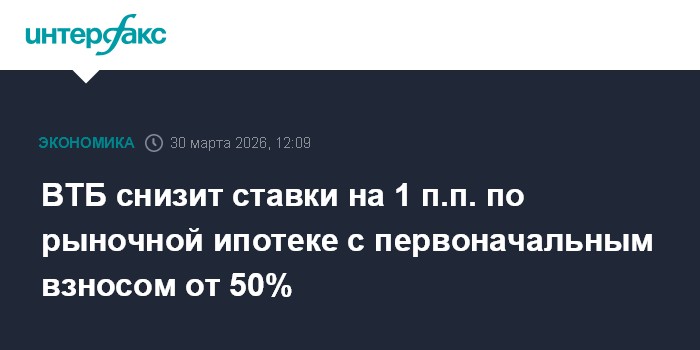 Москва. 30 марта. INTERFAX.RU - ВТБ с 1 апреля снижает ставки по рыночной ипотеке на 1 процентный пункт (п.п.), новые условия распространяются на кредиты с первоначальным взносом от 50%, говорится в сообщении кредитной организации.