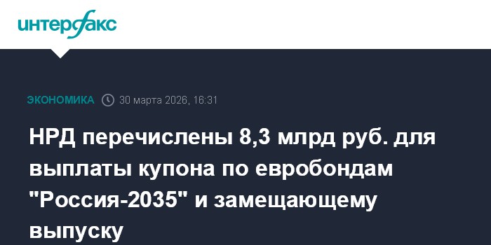 НРД перечислены 8,3 млрд руб. для выплаты купона по евробондам "Россия-2035" и замещающему выпуску