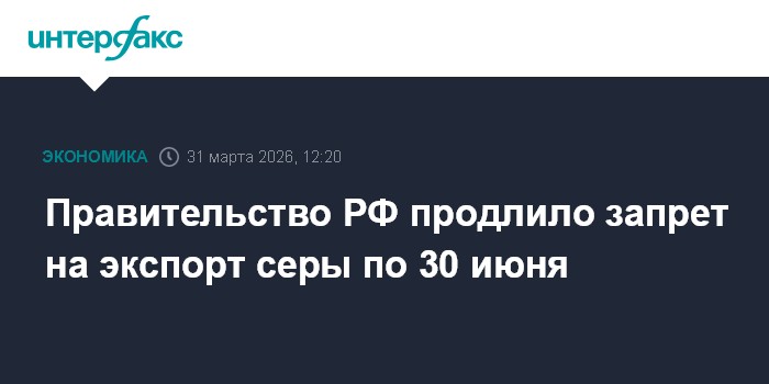Москва. 31 марта. INTERFAX.RU - Правительство РФ продлило запрет на вывоз технической серы по 30 июня 2026 года, сообщила пресс-служба кабмина.