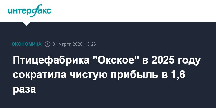 Москва. 31 марта. INTERFAX.RU - Рязанское АО "Окское", крупное предприятие птицеводческой отрасли, в 2025 году получило более 2,2 млрд рублей чистой прибыли по РСБУ, что в 1,6 раза меньше, чем в 2024 году, сказано в отчете АО.
