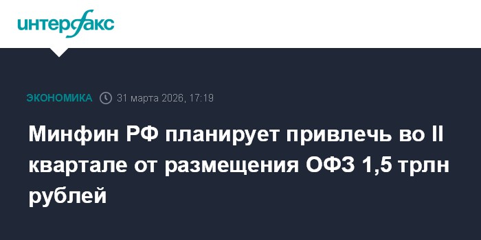 Москва. 31 марта. INTERFAX.RU - Минфин РФ во втором квартале 2026 года планирует привлечь от размещения облигаций федерального займа (ОФЗ) ориентировочно 1,5 трлн рублей, следует из графика аукционов на сайте министерства.