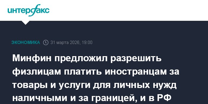 Москва. 31 марта. INTERFAX.RU - Минфин РФ предлагает предоставить физлицам-резидентам право осуществлять на территории иностранного государства расчеты с нерезидентами с использованием любых наличных денежных средств за приобретенные товары, работы и услуги, передаваемую информацию и результаты интеллектуальной деятельности, в том числе исключительные права на них, приобретаемые для личных нужд, не связанных с осуществлением предпринимательской деятельности, а на территории РФ – наличными рублями.