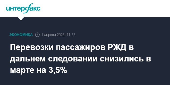 Москва. 1 апреля. INTERFAX.RU - Перевозки пассажиров по сети ОАО "РЖД" в дальнем следовании снизились в марте 2026 года на 3,5% по сравнению с мартом прошлого года, до 8,8 млн человек, сообщила компания.
