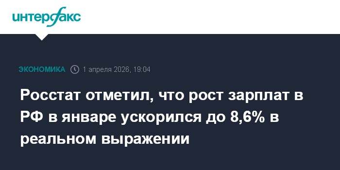 Москва. 1 апреля. INTERFAX.RU - Рост реального размера (с поправкой на инфляцию) заработной платы в РФ в январе 2026 года составил 8,6% в годовом выражении после повышения на 2,4% в декабре, на 5,8% в ноябре, на 6,1% в октябре, сообщил в среду Росстат.